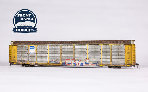 HO Scale Walthers Proto 89' Thrall Enclosed Tri-Level Auto Carrier - Ready to Run -- Union Pacific(R) Rack, Flat SP(TM) #517503 (yellow, silver, Shield Logo) Weathered